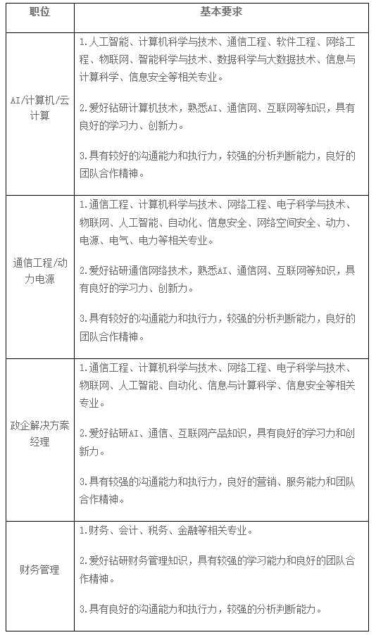 招聘职位:涵盖AI/计算机/云计算、通信工程/动力电源、政企解决方案经理、财务管理等相关职位。