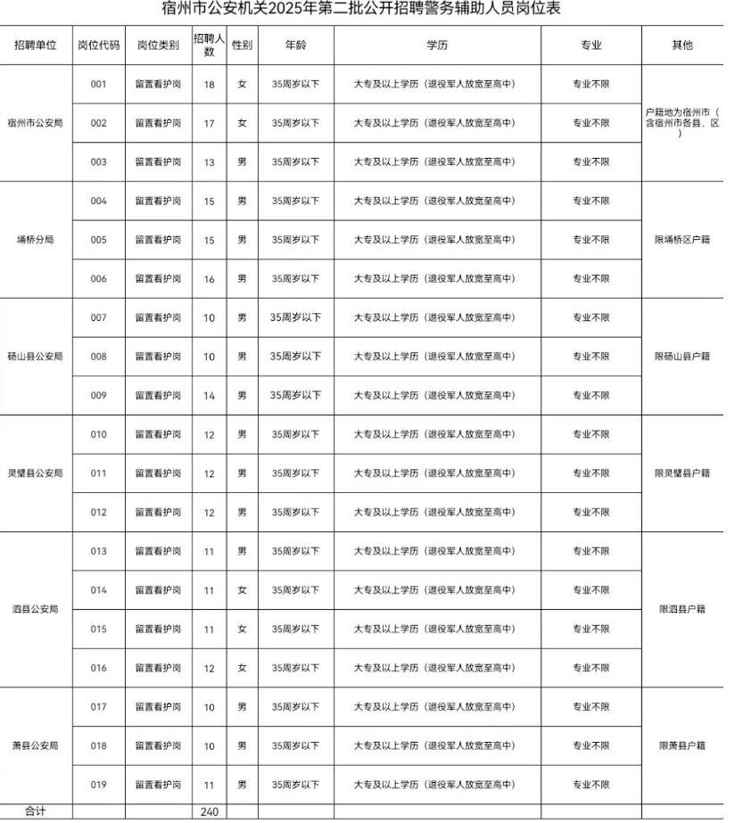 附件:宿州市公安机关2025年第二批公开招聘警务辅助人员岗位表