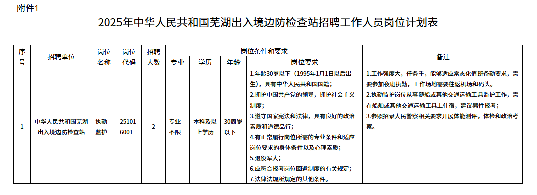 本次招聘警务辅助人员2名,详见附件1:2025年芜湖出入境边防检查站招聘工作人员岗位计划表》。